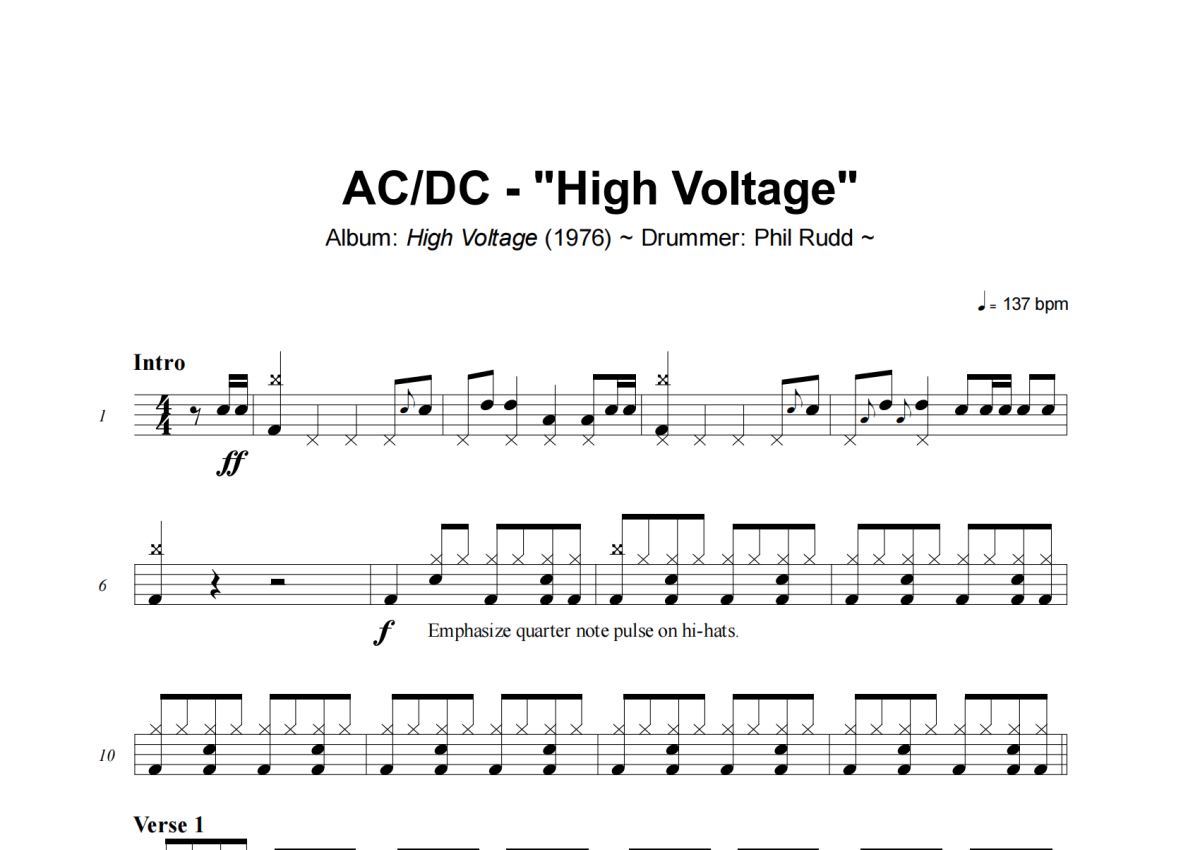 《High Voltage》是AC/DC演唱的一首歌曲,这份架子鼓谱共有五张高清图谱,图谱由 @小虎鼓谱 编配上传,图谱使用五线谱编配,使用这份High Voltage架子鼓谱,你将能够轻松地敲打出这首AC/DC的High Voltage,快来尝试吧。