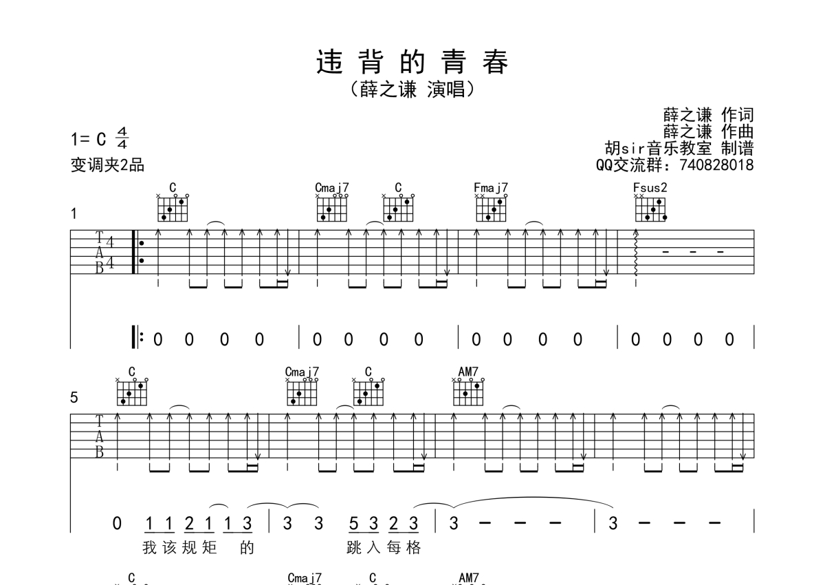 薛之谦《违背的青春》吉他谱 - C调弹唱六线谱