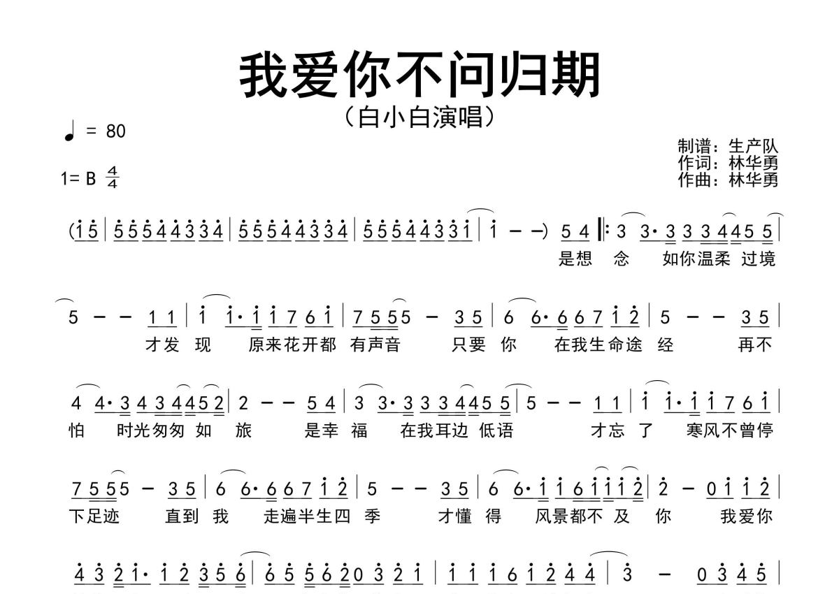 《我爱你不问归期》是白小白演唱的一首歌曲,原版简谱,拍号为4/4拍,歌曲速度为每分钟80拍,这份简谱共有一张高清图谱,图谱由 @生产队 编配上传白小白演唱的歌曲《我爱你不问归期》原版简谱,完整的前奏、间奏、尾奏solo编配。