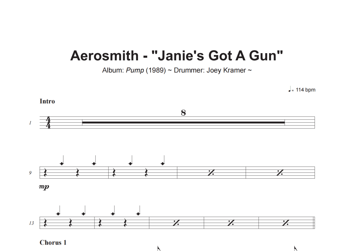 《Janie_s Got A Gun》是Aerosmith演唱的一首歌曲,这份架子鼓谱共有五张高清图谱,图谱由 @小虎鼓谱 编配上传,图谱使用五线谱编配,使用这份Janie_s Got A Gun架子鼓谱,你将能够轻松地敲打出这首Aerosmith的Janie_s Got A Gun,快来尝试吧。