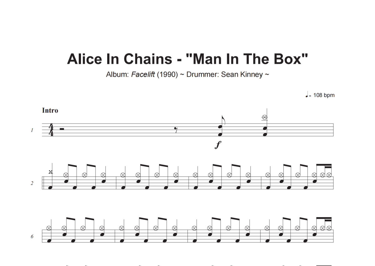 《Man In The Box》是Alice In Chains演唱的一首歌曲,这份架子鼓谱共有四张高清图谱,图谱由 @小虎鼓谱 编配上传,图谱使用五线谱编配,使用这份Man In The Box架子鼓谱,你将能够轻松地敲打出这首Alice In Chains的Man In The Box,快来尝试吧。