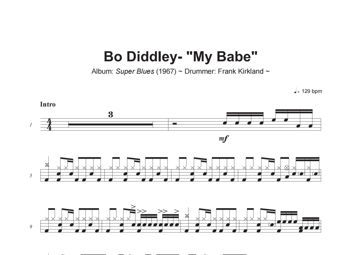 《My Babe》是Bo Diddley演唱的一首歌曲,这份架子鼓谱共有四张高清图谱,图谱由 @小虎鼓谱 编配上传,图谱使用五线谱编配,使用这份My Babe架子鼓谱,你将能够轻松地敲打出这首Bo Diddley的My Babe,快来尝试吧。