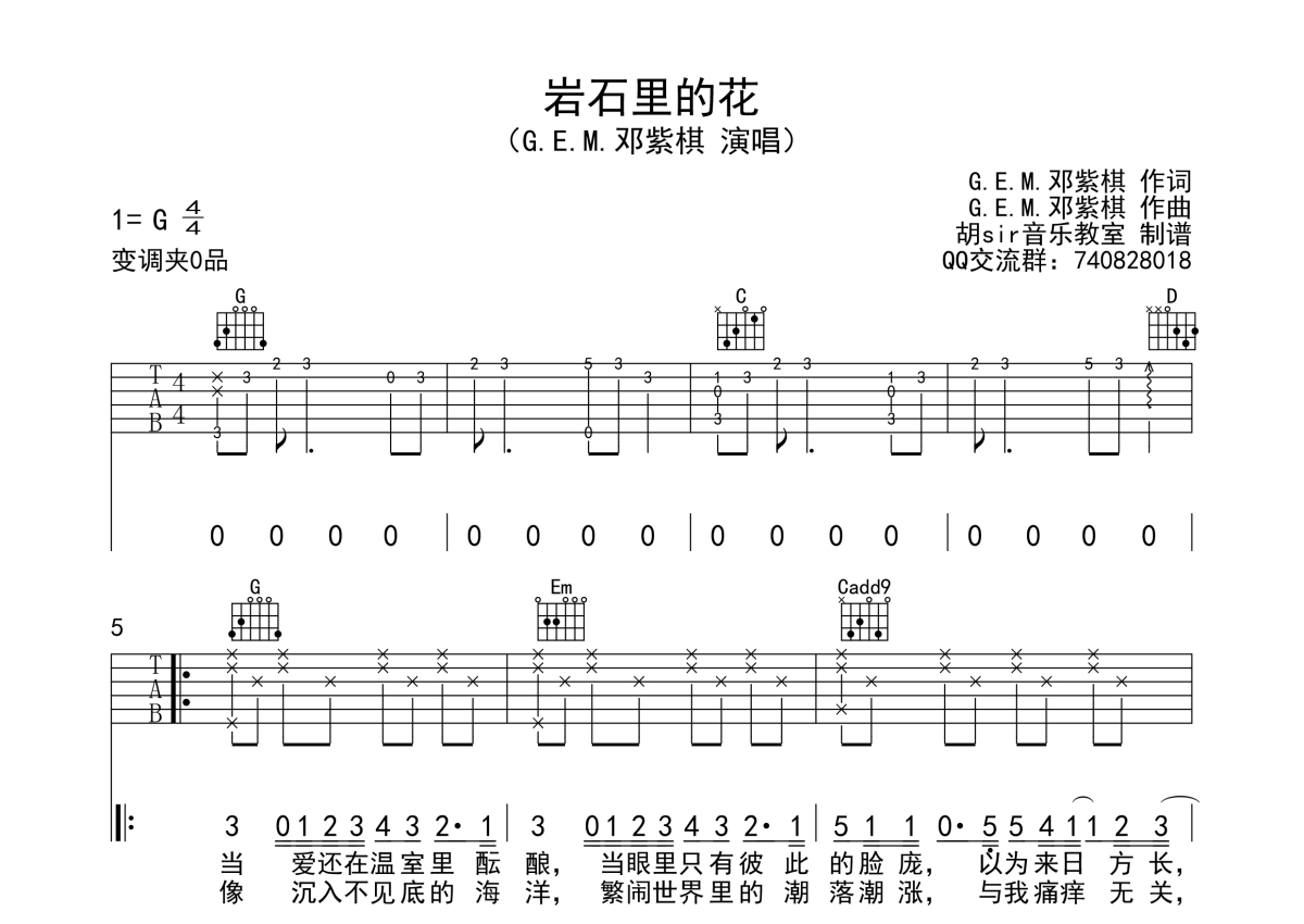 《岩石里的花》是邓紫棋演唱的一首歌曲,本吉他谱采用的是G调指法编配,这份吉他谱共有三张高清图谱,图谱由 @胡sir音乐 编配上传,图谱使用六线谱编配,包含吉他和弦指法、简谱以及歌词部分,使用这份岩石里的花吉他谱,可以让你更加方便地掌握这首歌曲的弹唱技巧,快来尝试吧。岩石里的花吉他谱,邓紫棋演唱的一首触动心灵的新歌,G调指法编配,有的花在温室里娇媚,有的花在风雪中挺立。你可知天山雪莲就生长在高山上接近雪线的乱石缝中。石缝间的生命要有多倔强,才能见到阳光、得以绽放?不管怎样,它从来没有想要放弃成长。