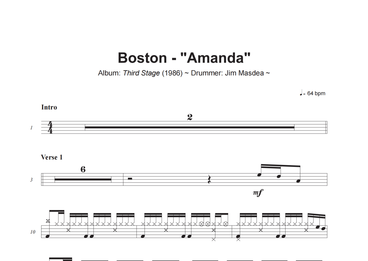 《Amanda》是Boston演唱的一首歌曲,这份架子鼓谱共有四张高清图谱,图谱由 @小虎鼓谱 编配上传,图谱使用五线谱编配,使用这份Amanda架子鼓谱,你将能够轻松地敲打出这首Boston的Amanda,快来尝试吧。