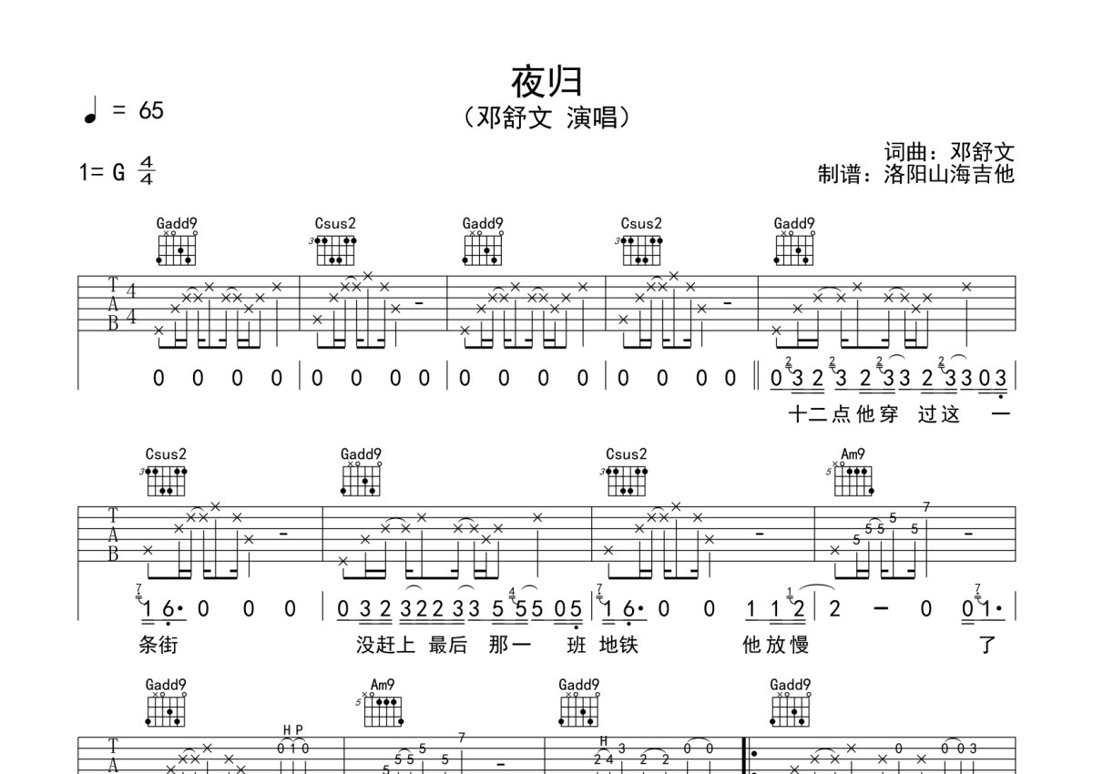邓舒文《夜归》吉他谱 - G调弹唱六线谱
