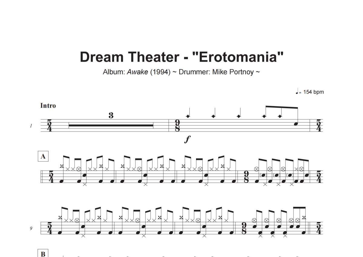 《Erotomania》是Dream Theater演唱的一首歌曲,这份架子鼓谱共有八张高清图谱,图谱由 @小虎鼓谱 编配上传,图谱使用五线谱编配,使用这份Erotomania架子鼓谱,你将能够轻松地敲打出这首Dream Theater的Erotomania,快来尝试吧。