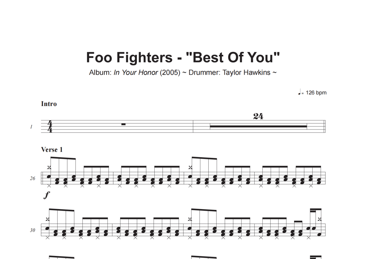 《Best Of You》是Foo Fighters演唱的一首歌曲,这份架子鼓谱共有四张高清图谱,图谱由 @小虎鼓谱 编配上传,图谱使用五线谱编配,使用这份Best Of You架子鼓谱,你将能够轻松地敲打出这首Foo Fighters的Best Of You,快来尝试吧。