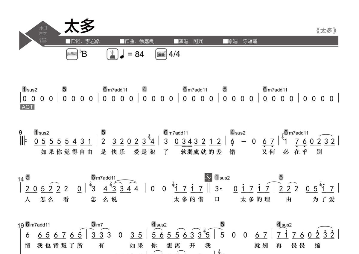 阿冗《太多》简谱 - 数字级数和弦谱