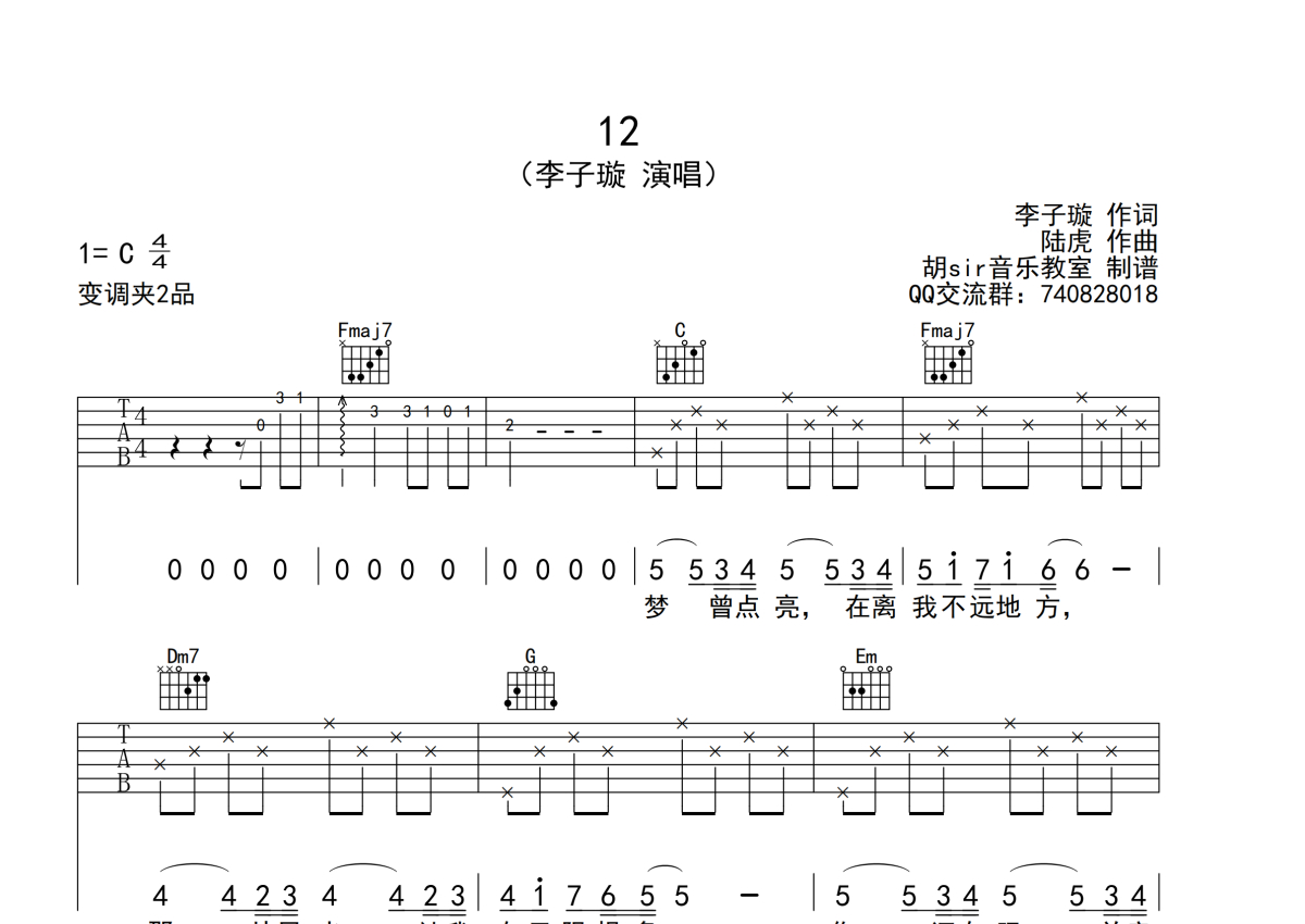 《12》是李子璇演唱的一首歌曲,本吉他谱采用的是C调指法编配,这份吉他谱共有两张高清图谱,图谱由 @胡sir音乐 编配上传,图谱使用六线谱编配,包含吉他和弦指法、简谱以及歌词部分,使用这份12吉他谱,可以让你更加方便地掌握这首歌曲的弹唱技巧,快来尝试吧。李子璇《12》吉他谱,C调指法,变调夹夹二品,火箭少女101女孩李子璇的一首曲风温暖的新歌单曲,寒冬夜里远空那颗闪光的星辰,即使渺小却也给人努力前行的勇气,愿李子璇这首乐观积极的歌曲,也能带给你这一份力量。
