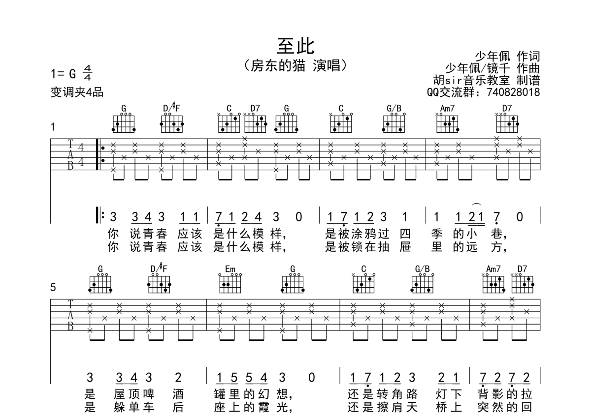 《至此》是房东的猫演唱的一首歌曲,本吉他谱采用的是G调指法编配,这份吉他谱共有两张高清图谱,图谱由 @胡sir音乐 编配上传,图谱使用六线谱编配,包含吉他和弦指法、简谱以及歌词部分,使用这份至此吉他谱,可以让你更加方便地掌握这首歌曲的弹唱技巧,快来尝试吧。房东的猫《至此》吉他谱,G调弹唱谱,变调夹夹第四品,动漫《我是江小白》的片尾曲,一首让人安静回忆青春的歌曲,轻柔舒缓的旋律,清新动人的歌词,唱出每一个人的成长心路历程,向过往依依挥手告别,奔向期待的未知未来。