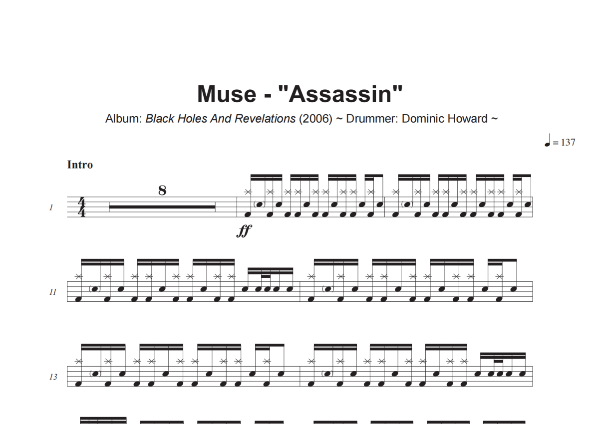 《Assassin》是Muse演唱的一首歌曲,这份架子鼓谱共有四张高清图谱,图谱由 @小虎鼓谱 编配上传,图谱使用五线谱编配,使用这份Assassin架子鼓谱,你将能够轻松地敲打出这首Muse的Assassin,快来尝试吧。