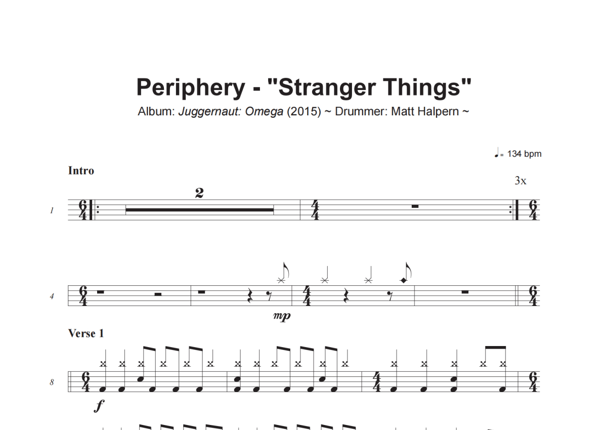 《Stranger Things》是Periphery演唱的一首歌曲,这份架子鼓谱共有九张高清图谱,图谱由 @小虎鼓谱 编配上传,图谱使用五线谱编配,使用这份Stranger Things架子鼓谱,你将能够轻松地敲打出这首Periphery的Stranger Things,快来尝试吧。