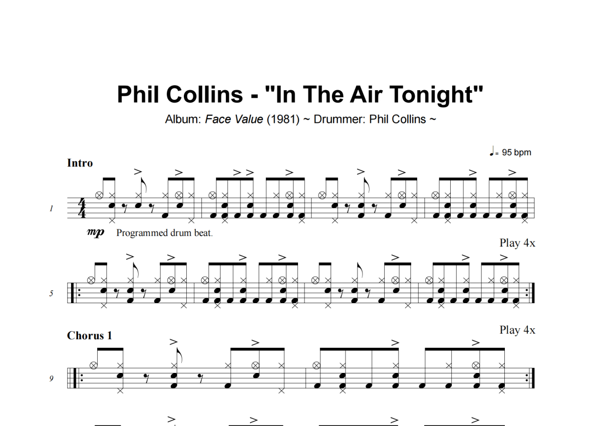 《In The Air Tonight》是Phil Collins演唱的一首歌曲,这份架子鼓谱共有三张高清图谱,图谱由 @小虎鼓谱 编配上传,图谱使用五线谱编配,使用这份In The Air Tonight架子鼓谱,你将能够轻松地敲打出这首Phil Collins的In The Air Tonight,快来尝试吧。