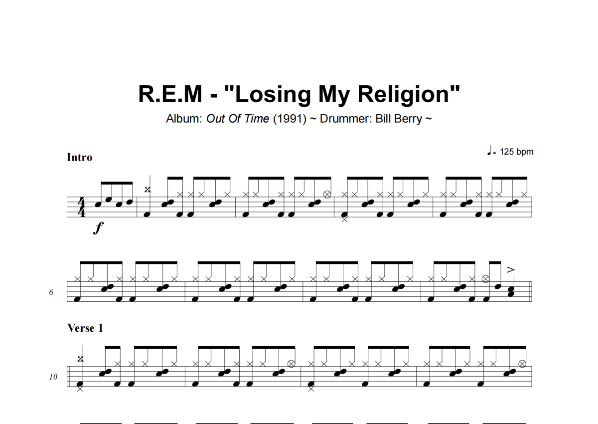 《Losing My Religion》是R.E.M.演唱的一首歌曲,这份架子鼓谱共有四张高清图谱,图谱由 @小虎鼓谱 编配上传,图谱使用五线谱编配,使用这份Losing My Religion架子鼓谱,你将能够轻松地敲打出这首R.E.M.的Losing My Religion,快来尝试吧。