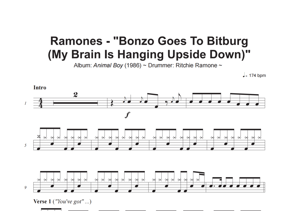 《Bonzo Goes To Bitburg (My Brain Is Hanging Upside Down)》是Ramones演唱的一首歌曲,这份架子鼓谱共有五张高清图谱,图谱由 @小虎鼓谱 编配上传,图谱使用五线谱编配,使用这份Bonzo Goes To Bitburg (My Brain Is Hanging Upside Down)架子鼓谱,你将能够轻松地敲打出这首Ramones的Bonzo Goes To Bitburg (My Brain Is Hanging Upside Down),快来尝试吧。