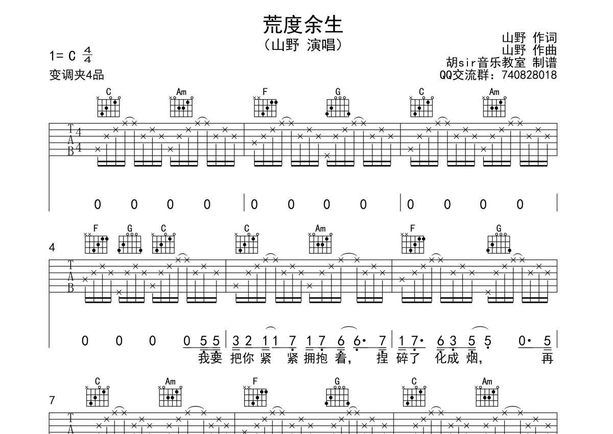 山野(李昊瀚)《荒度余生》吉他谱 - C调弹唱六线谱