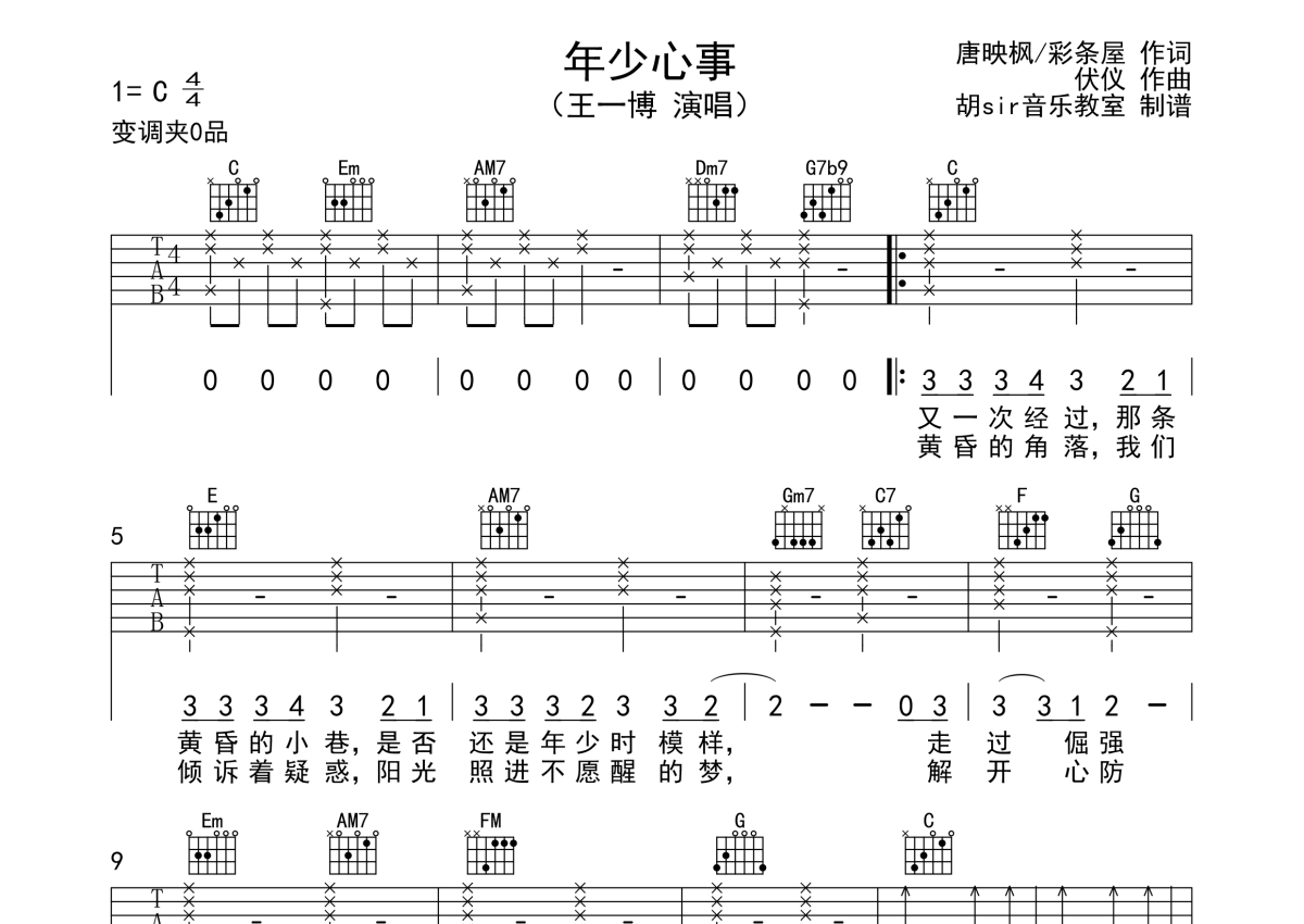 《年少心事》是王一博演唱的一首歌曲,本吉他谱采用的是C调指法编配,这份吉他谱共有两张高清图谱,图谱由 @胡sir音乐 编配上传,图谱使用六线谱编配,包含吉他和弦指法、简谱以及歌词部分,使用这份年少心事吉他谱,可以让你更加方便地掌握这首歌曲的弹唱技巧,快来尝试吧。年少心事吉他谱,王一博演唱,C调弹唱谱,青春动画电影《昨日青空》的一首青春成长曲,干净轻快的旋律,细致温暖的歌词,唱出我们青春时光懵懂却闪光的生活,那些少年的心事,那些为爱追逐的热血和勇气,带引我们共同回忆美好难忘的青春时代。