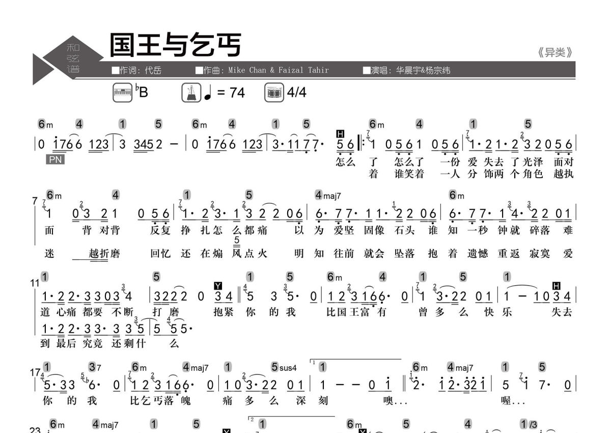 华晨宇&杨宗纬《国王与乞丐》简谱 - 数字级数和弦谱