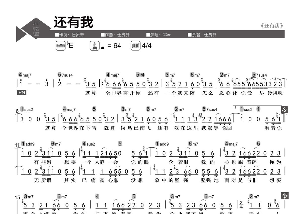 《还有我》是G2er演唱的一首歌曲,数字级数和弦谱,拍号为4/4拍,歌曲速度为每分钟64拍,这份简谱共有一张高清图谱,图谱由 @老杨教吉他 编配上传【歌曲信息】Key:bE Tempo:4/4 每分钟64拍。 【整理信息】按原曲完整整理。 【和弦标记】数字级数。 【和弦难度】大、小三和弦,大、小、属七和弦,加九和弦,挂留和弦,Slash和弦。