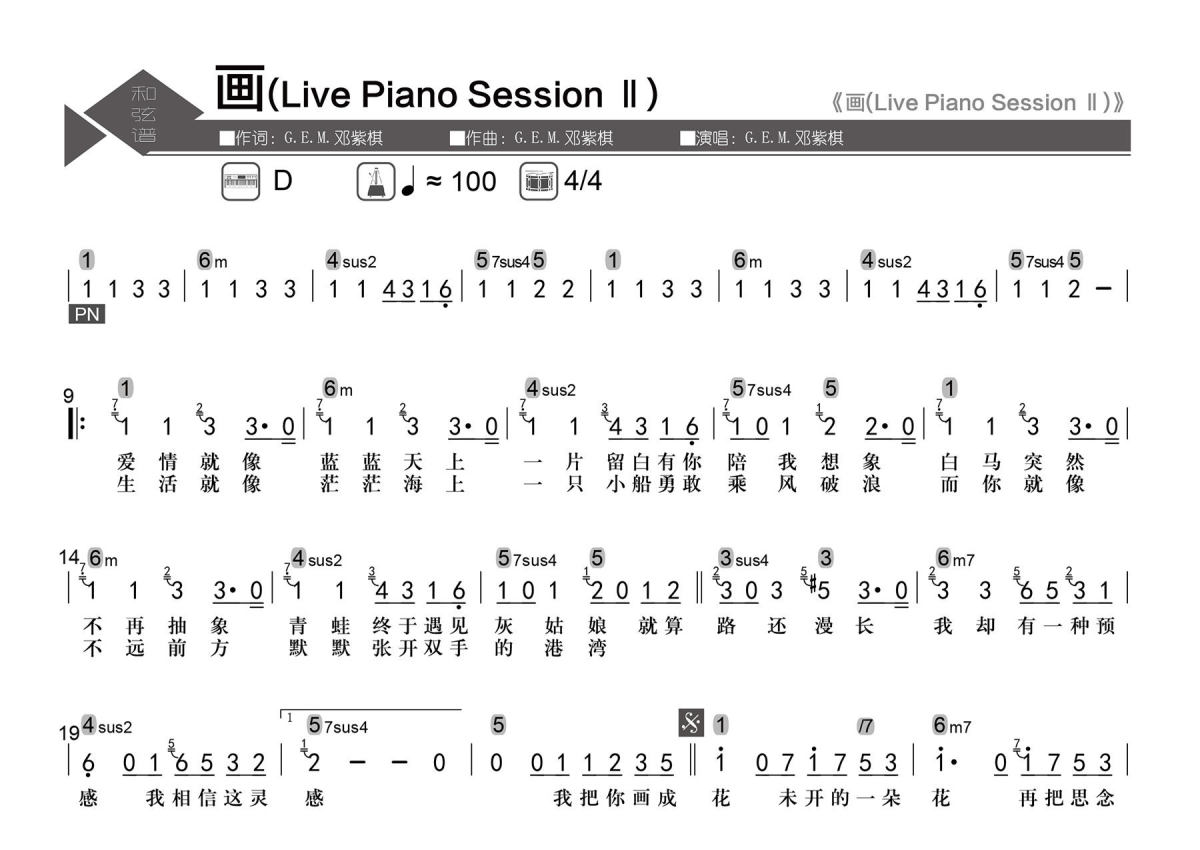 《画(Live Piano Session Ⅱ)》是G.E.M. 邓紫棋演唱的一首歌曲,数字级数和弦谱,拍号为4/4拍,歌曲速度为每分钟100拍,这份简谱共有一张高清图谱,图谱由 @老杨教吉他 编配上传【歌曲信息】Key:D Tempo:4/4 每分钟100拍。 【整理信息】按原曲完整整理。 【和弦标记】数字级数。 【和弦难度】大、小三和弦,小、属七和弦,挂留和弦。