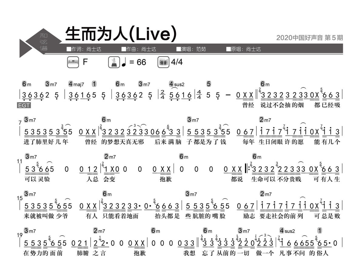 范茹《生而为人》简谱 - 数字级数和弦谱