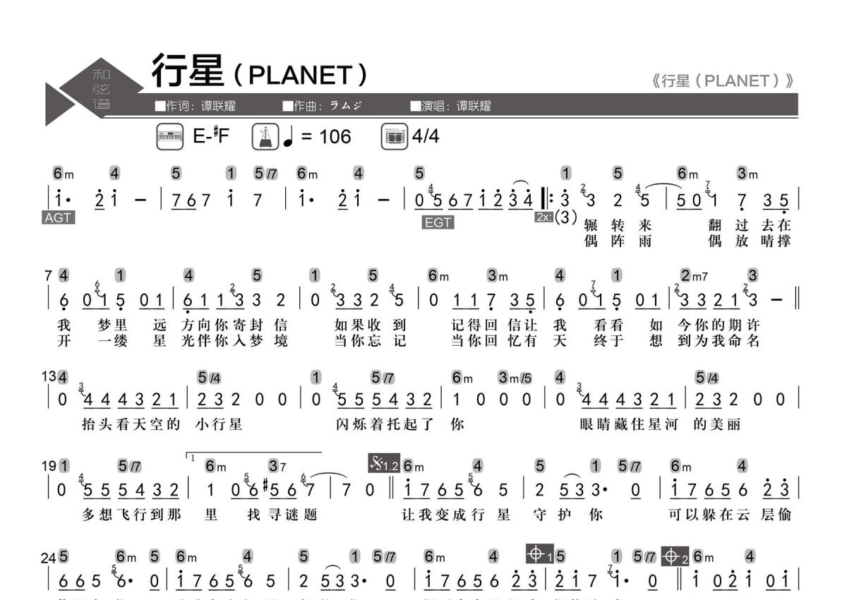 《行星(PLANET)》是PLANET演唱的一首歌曲,数字级数和弦谱,拍号为4/4拍,歌曲速度为每分钟106拍,这份简谱共有一张高清图谱,图谱由 @老杨教吉他 编配上传【歌曲信息】Key:E-#F Tempo:4/4 每分钟106拍。 【整理信息】按原曲完整整理。 【和弦标记】数字级数。 【和弦难度】大、小三和弦,转位和弦/Slash和弦,大、小、属七和弦,小六和弦。