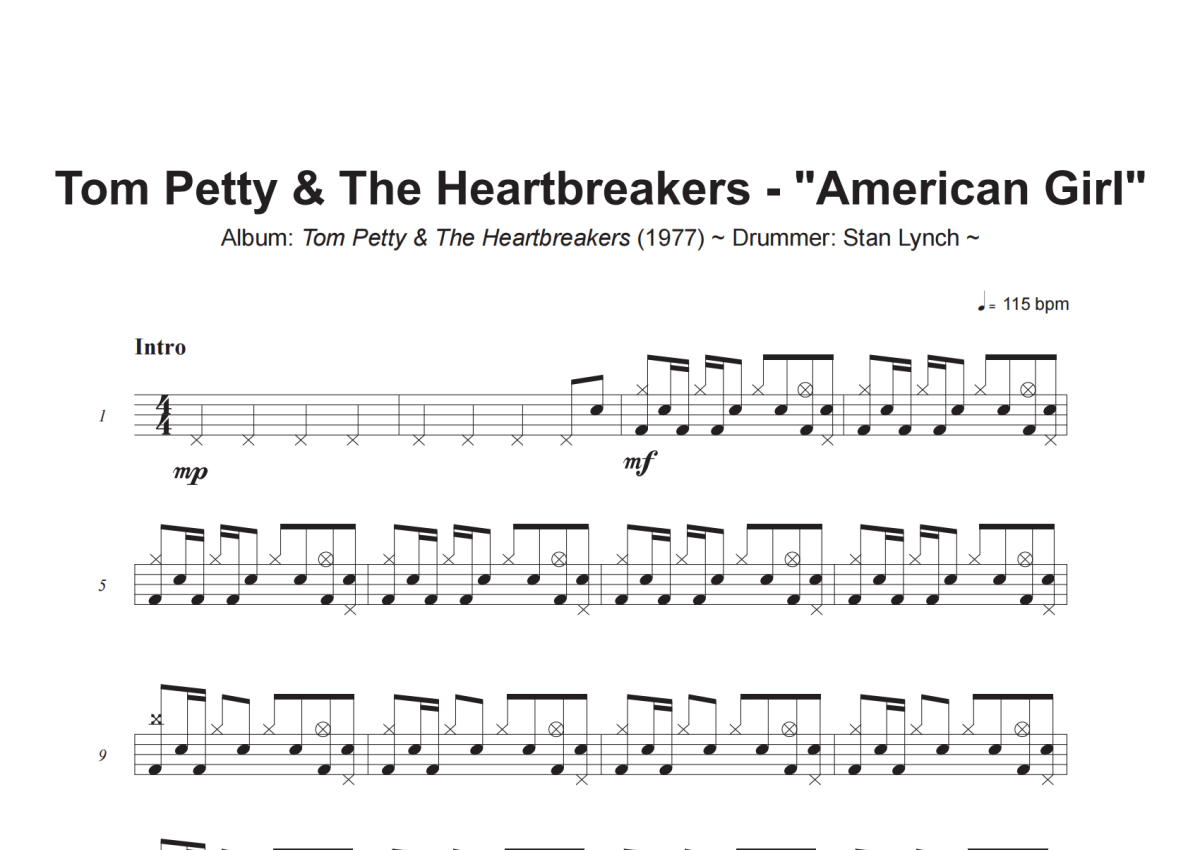 《American Girl》是Tom Petty _ The Heartbreakers演唱的一首歌曲,这份架子鼓谱共有四张高清图谱,图谱由 @小虎鼓谱 编配上传,图谱使用五线谱编配,使用这份American Girl架子鼓谱,你将能够轻松地敲打出这首Tom Petty _ The Heartbreakers的American Girl,快来尝试吧。