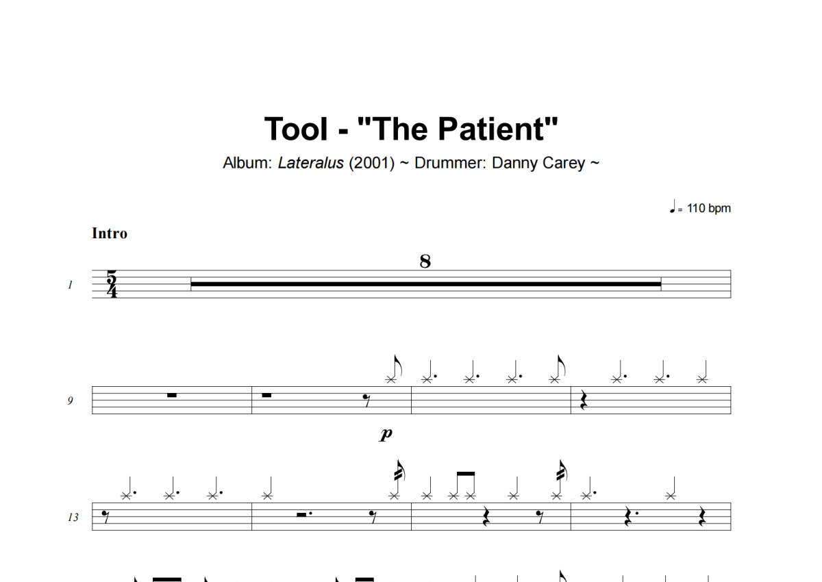《The Patient》是Tool演唱的一首歌曲,这份架子鼓谱共有六张高清图谱,图谱由 @小虎鼓谱 编配上传,图谱使用五线谱编配,使用这份The Patient架子鼓谱,你将能够轻松地敲打出这首Tool的The Patient,快来尝试吧。