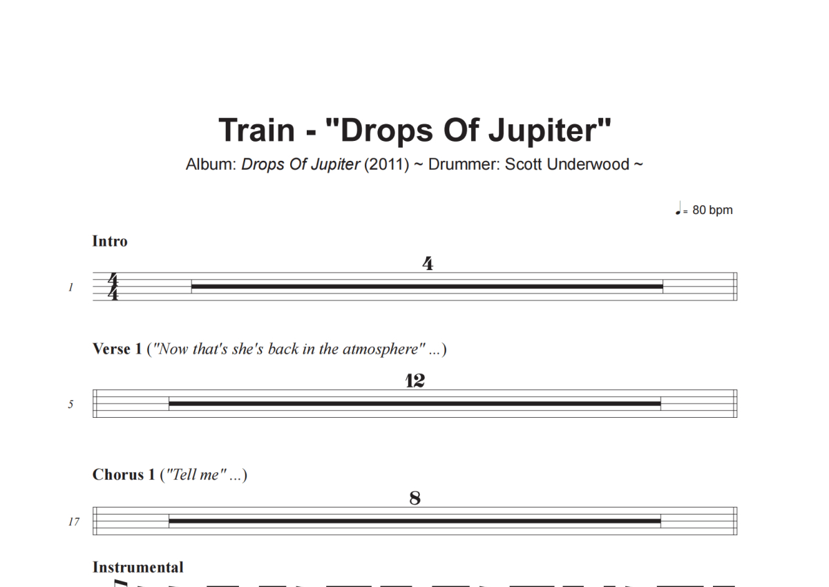 《Drops Of Jupiter》是Train演唱的一首歌曲,这份架子鼓谱共有三张高清图谱,图谱由 @小虎鼓谱 编配上传,图谱使用五线谱编配,使用这份Drops Of Jupiter架子鼓谱,你将能够轻松地敲打出这首Train的Drops Of Jupiter,快来尝试吧。