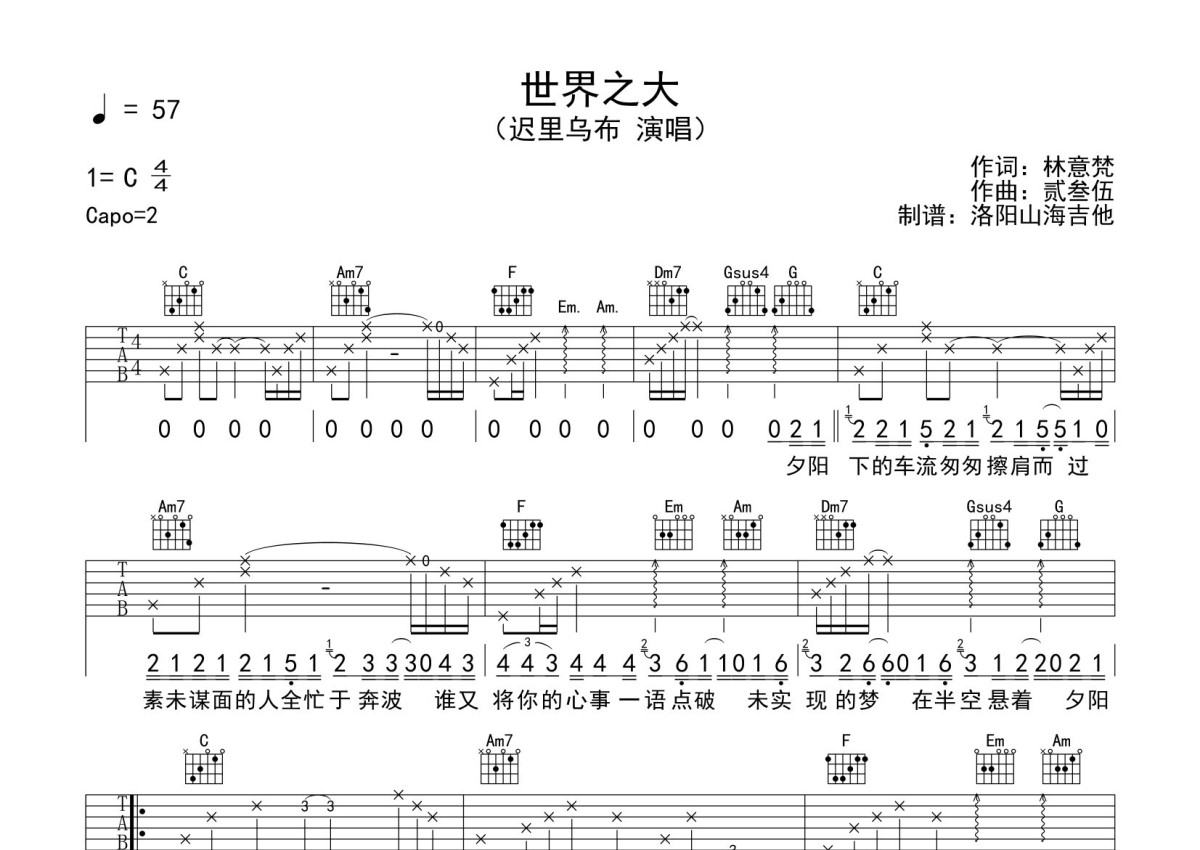 迟里乌布《世界之大》吉他谱 - C调弹唱六线谱