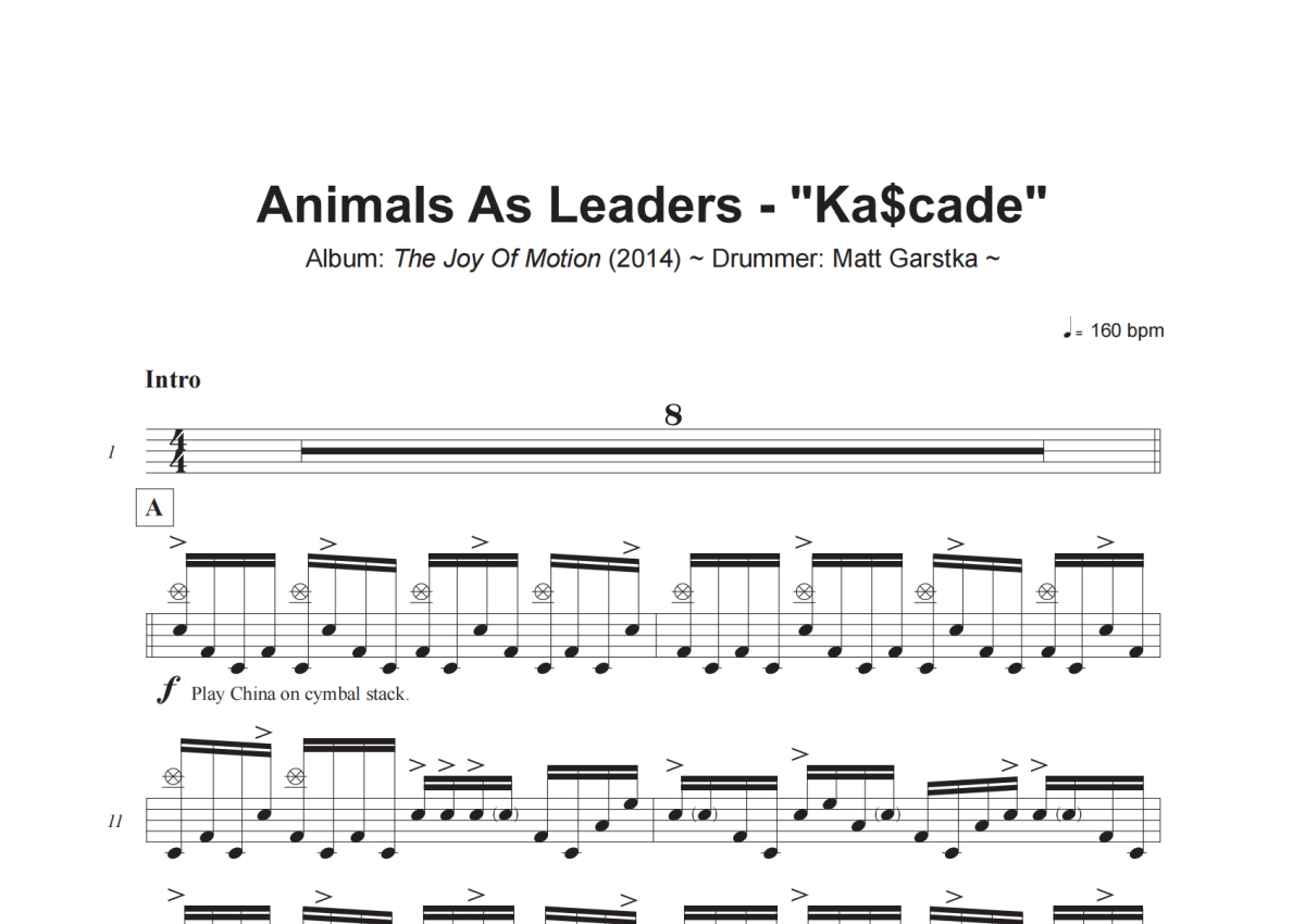 《Ka$cade》是Animals As Leaders演唱的一首歌曲,这份架子鼓谱共有十一张高清图谱,图谱由 @小虎鼓谱 编配上传,图谱使用五线谱编配,使用这份Ka$cade架子鼓谱,你将能够轻松地敲打出这首Animals As Leaders的Ka$cade,快来尝试吧。