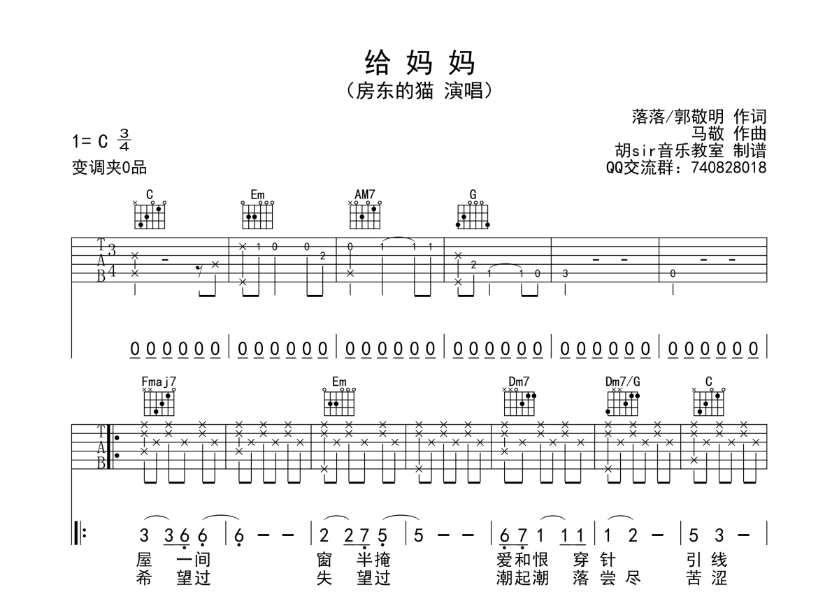 《给妈妈》是房东的猫演唱的一首歌曲,本吉他谱采用的是C调指法编配,这份吉他谱共有两张高清图谱,图谱由 @胡sir音乐 编配上传,图谱使用六线谱编配,包含吉他和弦指法、简谱以及歌词部分,使用这份给妈妈吉他谱,可以让你更加方便地掌握这首歌曲的弹唱技巧,快来尝试吧。给妈妈吉他谱,房东的猫演唱,C调指法,电影《悲伤逆流成河》插曲,送个每一位无私温暖的母亲。一首低回深情的歌曲,房东的猫用婉转温暖的歌声,唱尽了母女间从不言说的长情,青春或不圆满,但因有了亲情的庇护,所有的伤痛都将是逆流而上的河,泅渡获得新生。