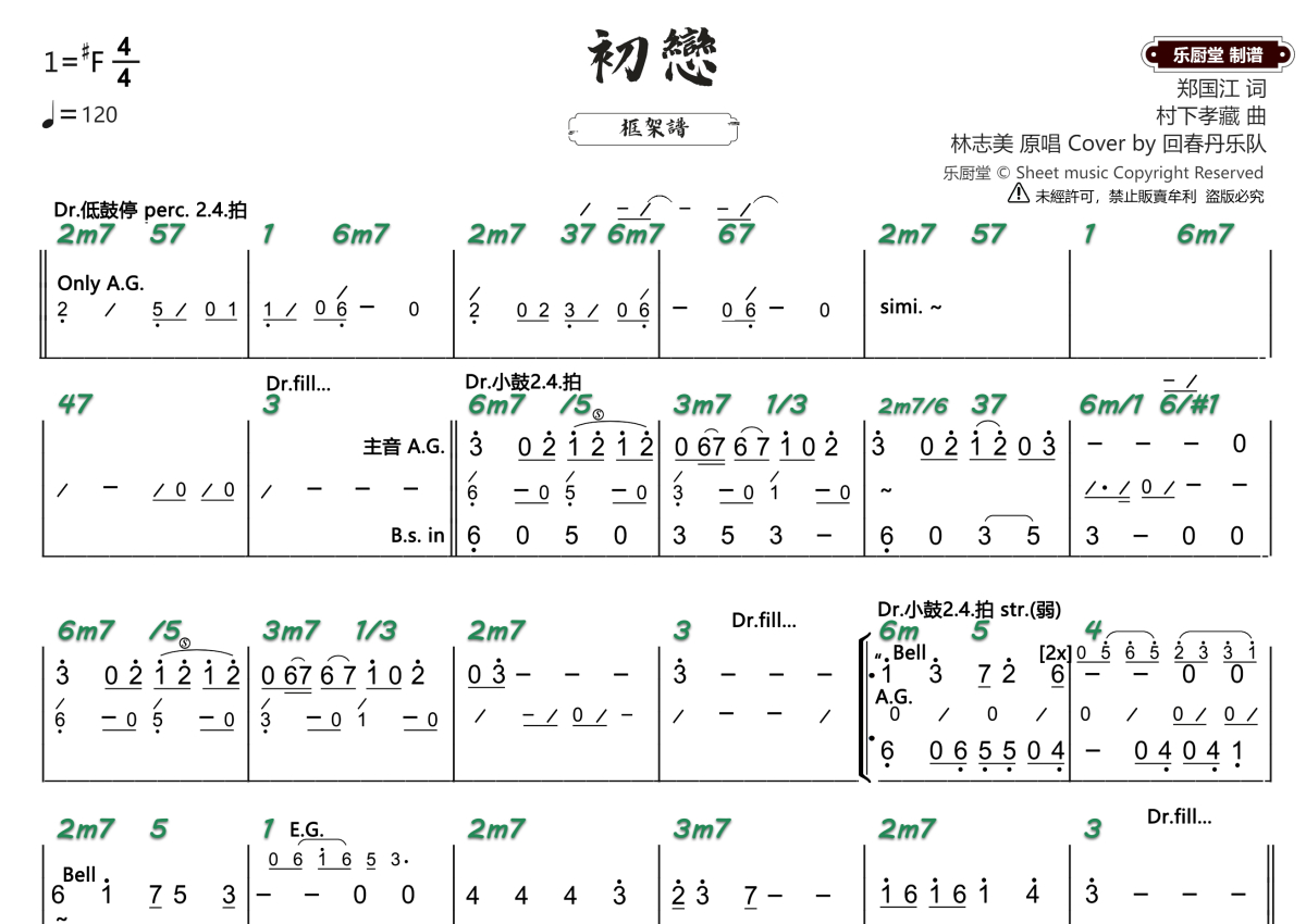 《初恋》是回春丹演唱的一首歌曲,框架谱,拍号为4/4拍,歌曲速度为每分钟120拍,这份乐队总谱共有两张高清图谱,图谱由 @乐厨堂 编配上传。
