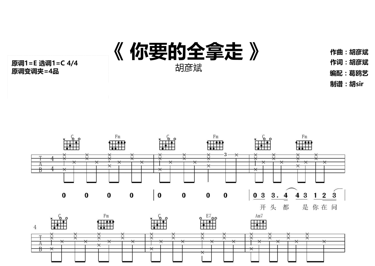 《你要的全拿走》是胡彦斌演唱的一首歌曲,本吉他谱采用的是C调指法编配,这份吉他谱共有三张高清图谱,图谱由 @胡sir音乐 编配上传,图谱使用六线谱编配,包含吉他和弦指法、简谱以及歌词部分,使用这份你要的全拿走吉他谱,可以让你更加方便地掌握这首歌曲的弹唱技巧,快来尝试吧。胡彦斌《你要的全拿走》吉他谱,原调E,选调C,变调夹夹四品,胡彦斌一首原创虐心歌曲,一首R&B风格的歌曲,唱出了分手后的依恋,副歌部分即兴旋律很强,歌声完美融入旋律当中,独特的咬字,独具一格的节奏感,无不带给人耳目一新之感,让人听着十分过瘾。