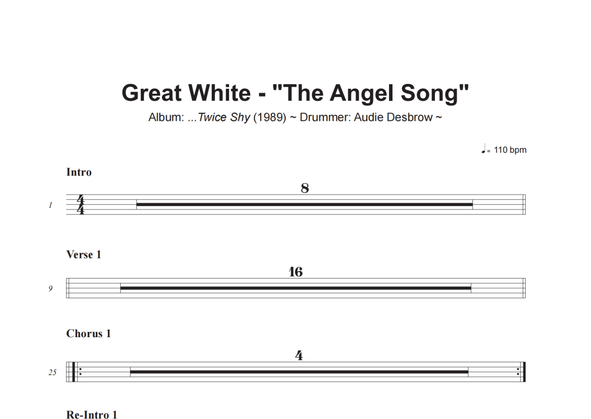 《The Angel Song》是Great White演唱的一首歌曲,这份架子鼓谱共有三张高清图谱,图谱由 @小虎鼓谱 编配上传,图谱使用五线谱编配,使用这份The Angel Song架子鼓谱,你将能够轻松地敲打出这首Great White的The Angel Song,快来尝试吧。