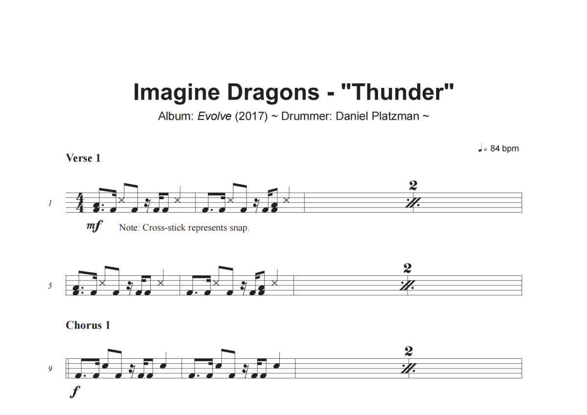 《Thunder》是Imagine Dragons演唱的一首歌曲,这份架子鼓谱共有两张高清图谱,图谱由 @小虎鼓谱 编配上传,图谱使用五线谱编配,使用这份Thunder架子鼓谱,你将能够轻松地敲打出这首Imagine Dragons的Thunder,快来尝试吧。