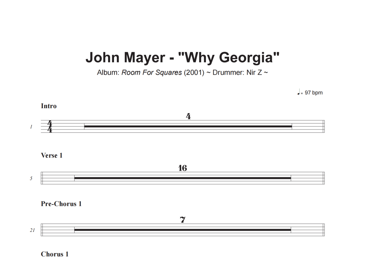 《Why Georgia》是John Mayer演唱的一首歌曲,这份架子鼓谱共有三张高清图谱,图谱由 @小虎鼓谱 编配上传,图谱使用五线谱编配,使用这份Why Georgia架子鼓谱,你将能够轻松地敲打出这首John Mayer的Why Georgia,快来尝试吧。