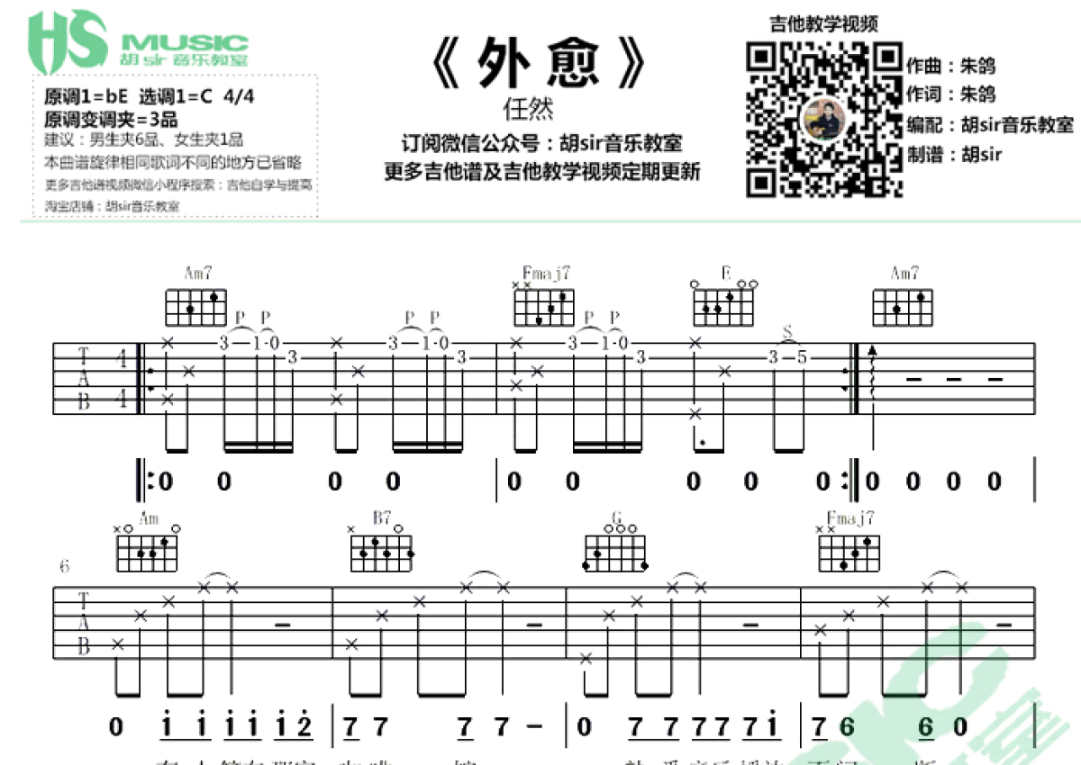 《外愈》是任然演唱的一首歌曲,本吉他谱采用的是C调指法编配,这份吉他谱共有两张高清图谱,图谱由 @胡sir音乐 编配上传,图谱使用六线谱编配,包含吉他和弦指法、简谱以及歌词部分,曲谱配备了相关的视频提供浏览,使用这份外愈吉他谱,可以让你更加方便地掌握这首歌曲的弹唱技巧,快来尝试吧。任然《外愈》吉他谱,原调降E,选用C调指法,简单版弹唱谱,并带来吉他视频演示。你带来的伤痛外愈就好,一首伤感的网络歌曲。所有的伤,都会慢慢愈合。所有的愈合,都遮挡不住曾经的伤。你我面对的,或者不是同样的未来,却是一样的终结。这是一件,永无愈合可能的事。