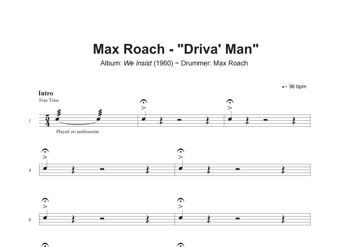 《Driva' Man》是Max Roach演唱的一首歌曲,这份架子鼓谱共有四张高清图谱,图谱由 @小虎鼓谱 编配上传,图谱使用五线谱编配,使用这份Driva' Man架子鼓谱,你将能够轻松地敲打出这首Max Roach的Driva' Man,快来尝试吧。