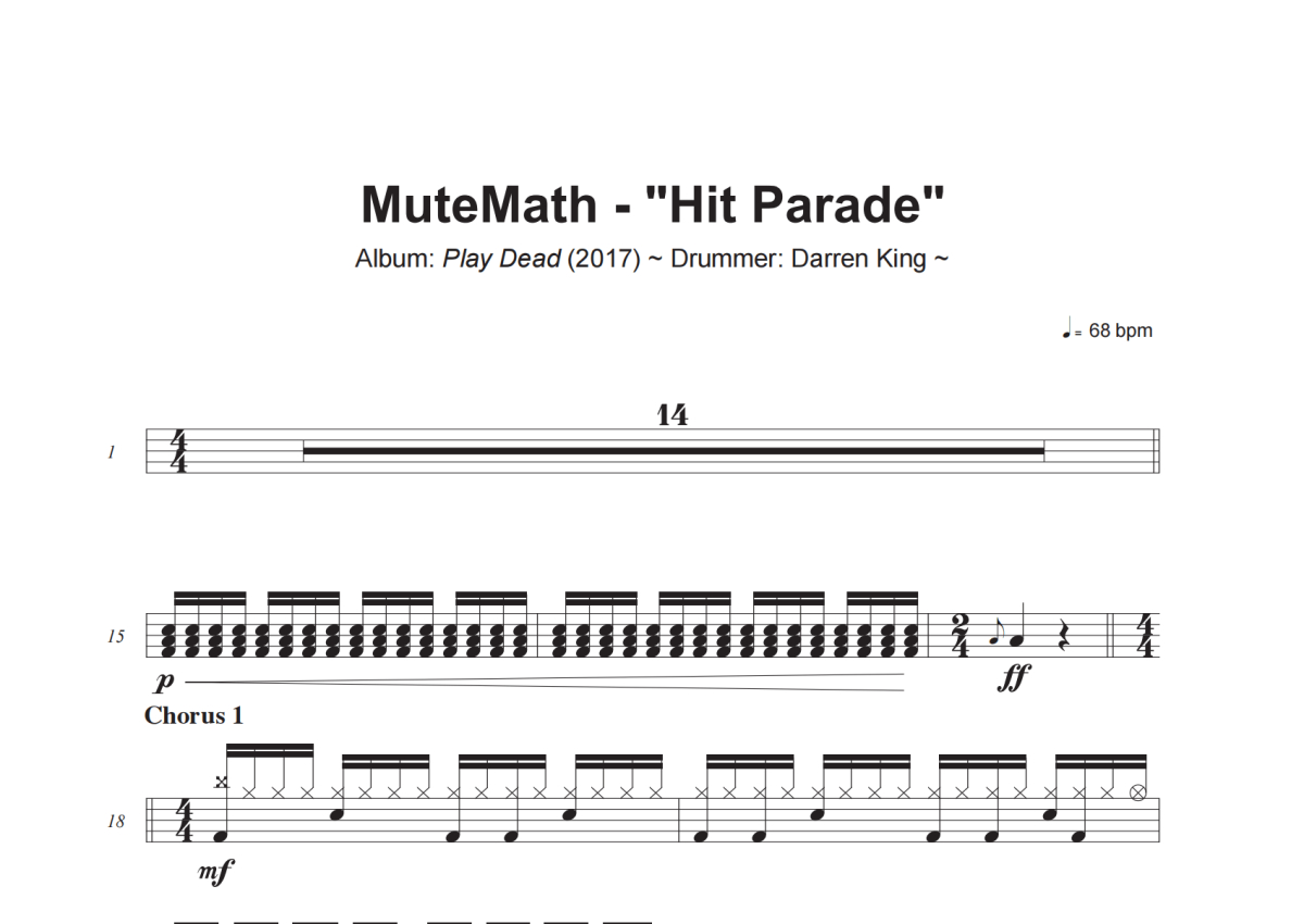 《Hit Parade》是Mutemath演唱的一首歌曲,这份架子鼓谱共有四张高清图谱,图谱由 @小虎鼓谱 编配上传,图谱使用五线谱编配,使用这份Hit Parade架子鼓谱,你将能够轻松地敲打出这首Mutemath的Hit Parade,快来尝试吧。