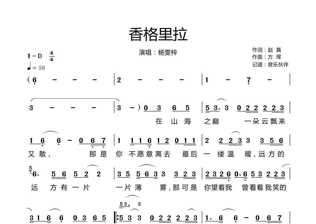 《香格里拉》是杨雯梓演唱的一首歌曲,拍号为4/4拍,歌曲速度为每分钟58拍,这份简谱共有两张高清图谱,图谱由 @音乐伙伴 编配上传。