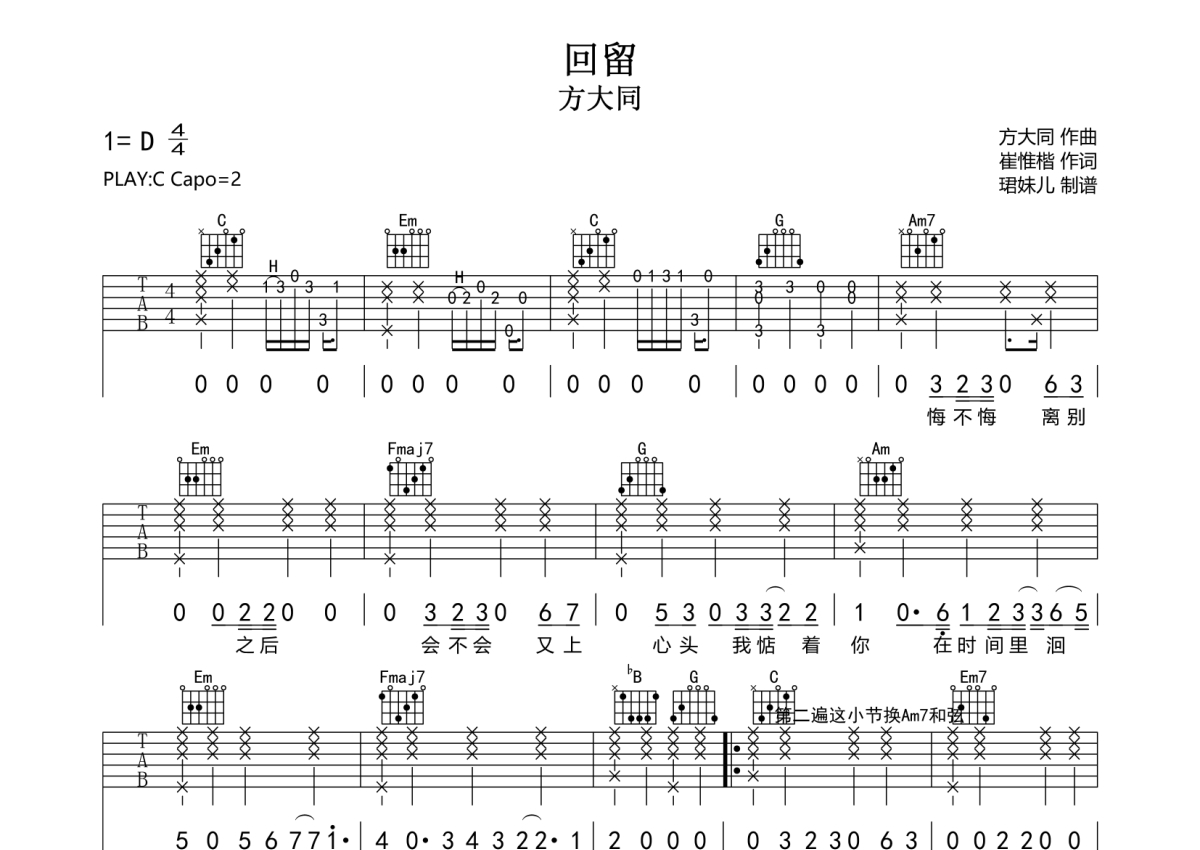 《回留》是方大同演唱的一首歌曲,拍号为4/4拍,歌曲速度为每分钟85拍,歌曲原调为C调,本吉他谱采用的是C调指法编配,变调夹2品弹奏即为原调,当然也可以根据自己的音域改变变调夹位置,或者通过改变和弦调性,以方便自己弹奏,这份吉他谱共有两张高清图谱,图谱由 @珺妹儿 编配上传,图谱使用六线谱编配,包含吉他和弦指法、简谱以及歌词部分,使用这份回留吉他谱,可以让你更加方便地掌握这首歌曲的弹唱技巧,快来尝试吧。