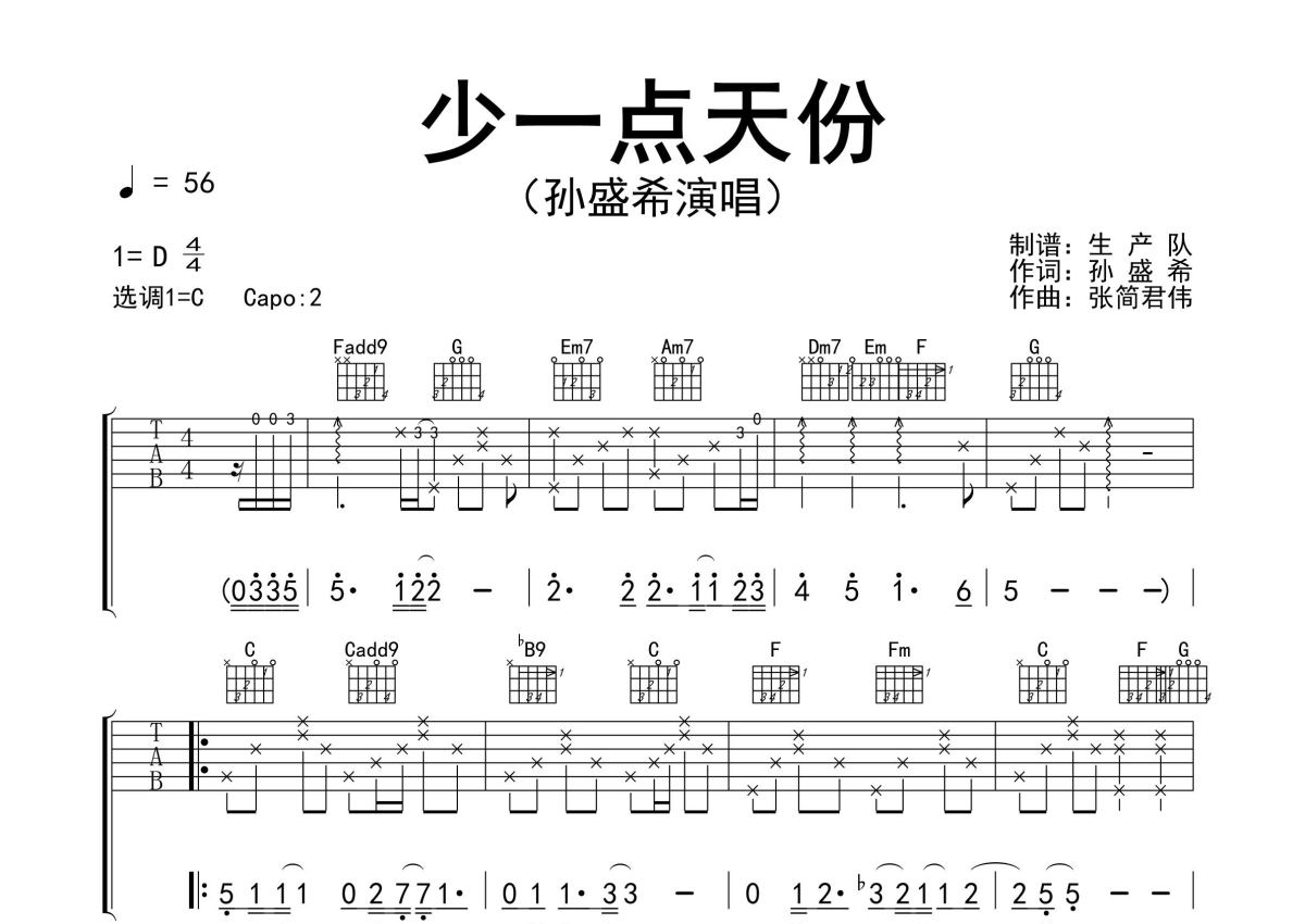 《少一点天份》是孙盛希演唱的一首歌曲,精编完美版,拍号为4/4拍,歌曲速度为每分钟56拍,歌曲原调为D调,但由于原调指法比较难,为了方便弹奏,本吉他谱采用的是C调指法编配,变调夹2品弹奏即为原调,当然也可以根据自己的音域改变变调夹位置,或者通过改变和弦调性,以方便自己弹奏,这份吉他谱共有三张高清图谱,图谱由 @生产队 编配上传,图谱使用六线谱编配,包含吉他和弦指法、简谱以及歌词部分,使用这份少一点天份吉他谱,可以让你更加方便地掌握这首歌曲的弹唱技巧,快来尝试吧。孙盛希演唱的歌曲《少一点天份》原版吉他谱,完整的前奏、间奏solo编配,注意体会转调的魅力,一首动听的抒情歌曲,值得推荐!。