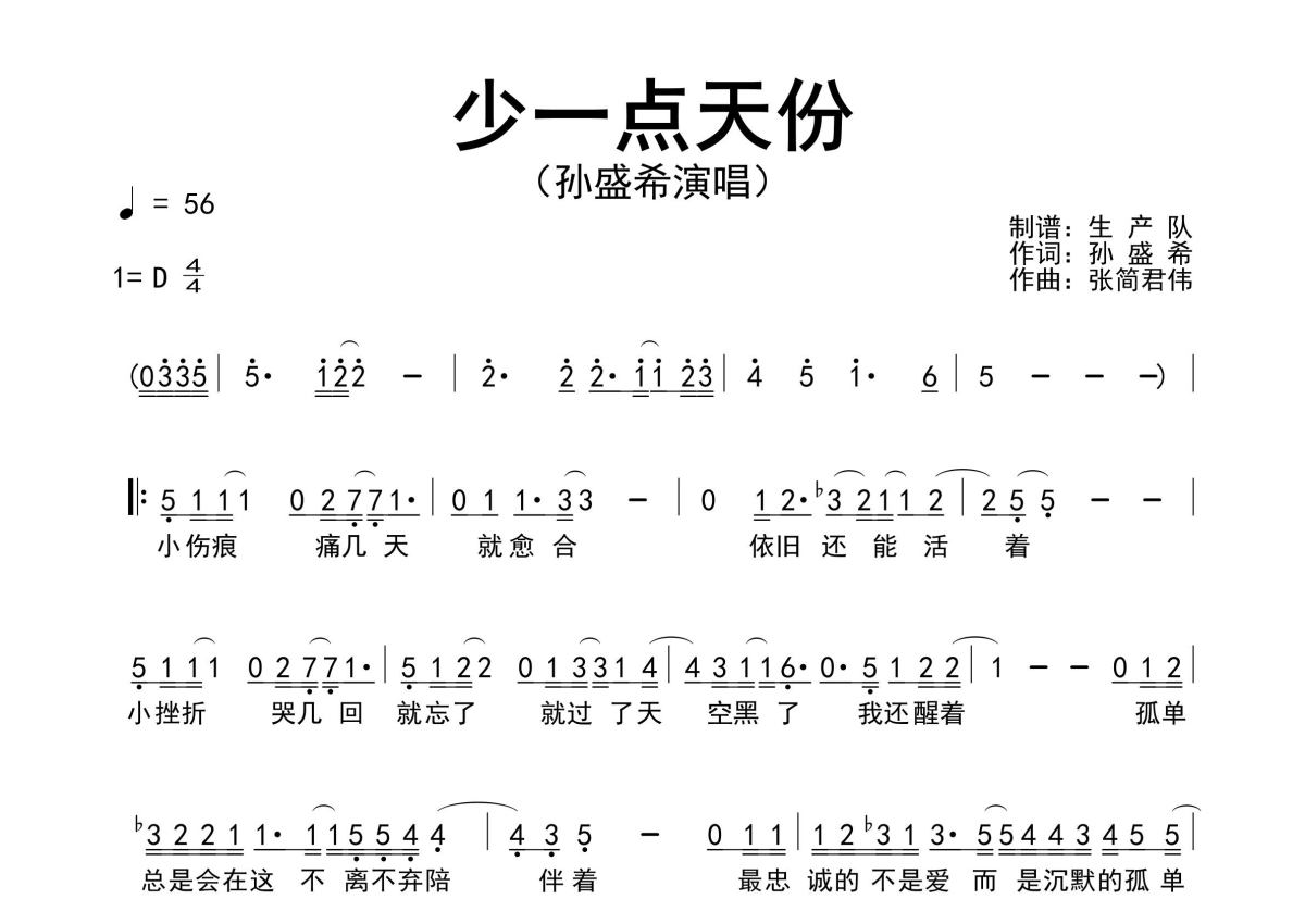 《少一点天份》是孙盛希演唱的一首歌曲,原版简谱,拍号为4/4拍,歌曲速度为每分钟56拍,这份简谱共有两张高清图谱,图谱由 @生产队 编配上传孙盛希演唱的歌曲《少一点天份》原版简谱,完整的前奏、间奏solo编配,注意体会转调的魅力,一首动听的抒情歌曲,值得推荐!。