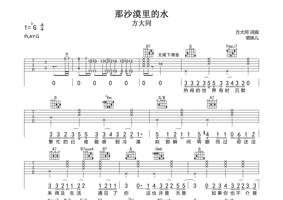 方大同《那沙漠里的水》吉他谱 - G调弹唱六线谱