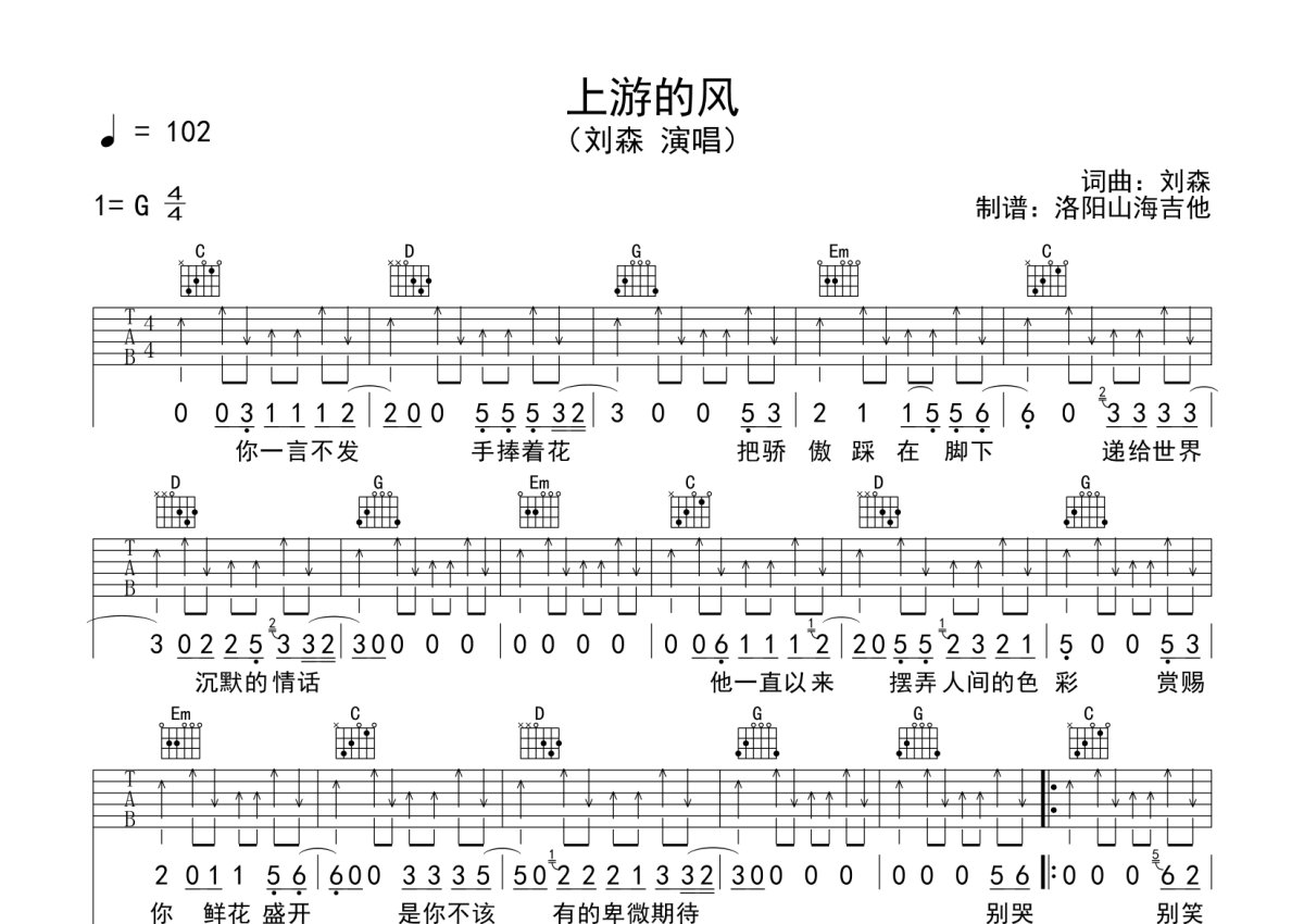 刘森《上游的风》吉他谱 - G调弹唱六线谱