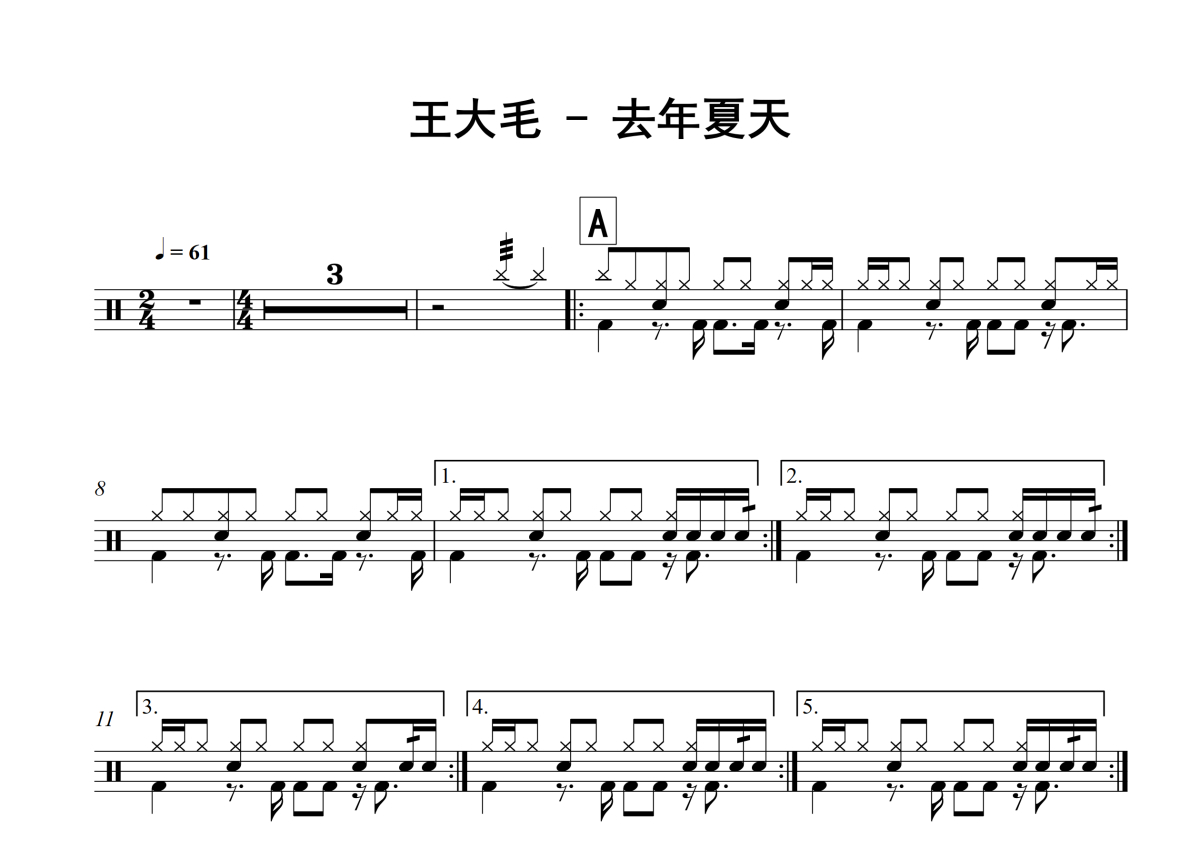 王大毛《去年夏天》架子鼓谱