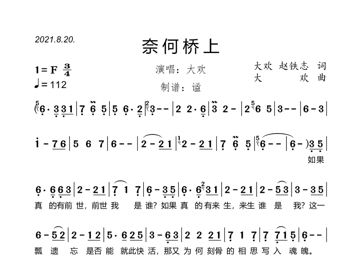《奈何桥上》是大欢演唱的一首歌曲,拍号为3/4拍,歌曲速度为每分钟112拍,这份简谱共有两张高清图谱,图谱由 @谧 编配上传大欢演唱的《奈何桥上》,原版完整简谱,F调,3/4拍,速度112,谧精心制谱,共2页。