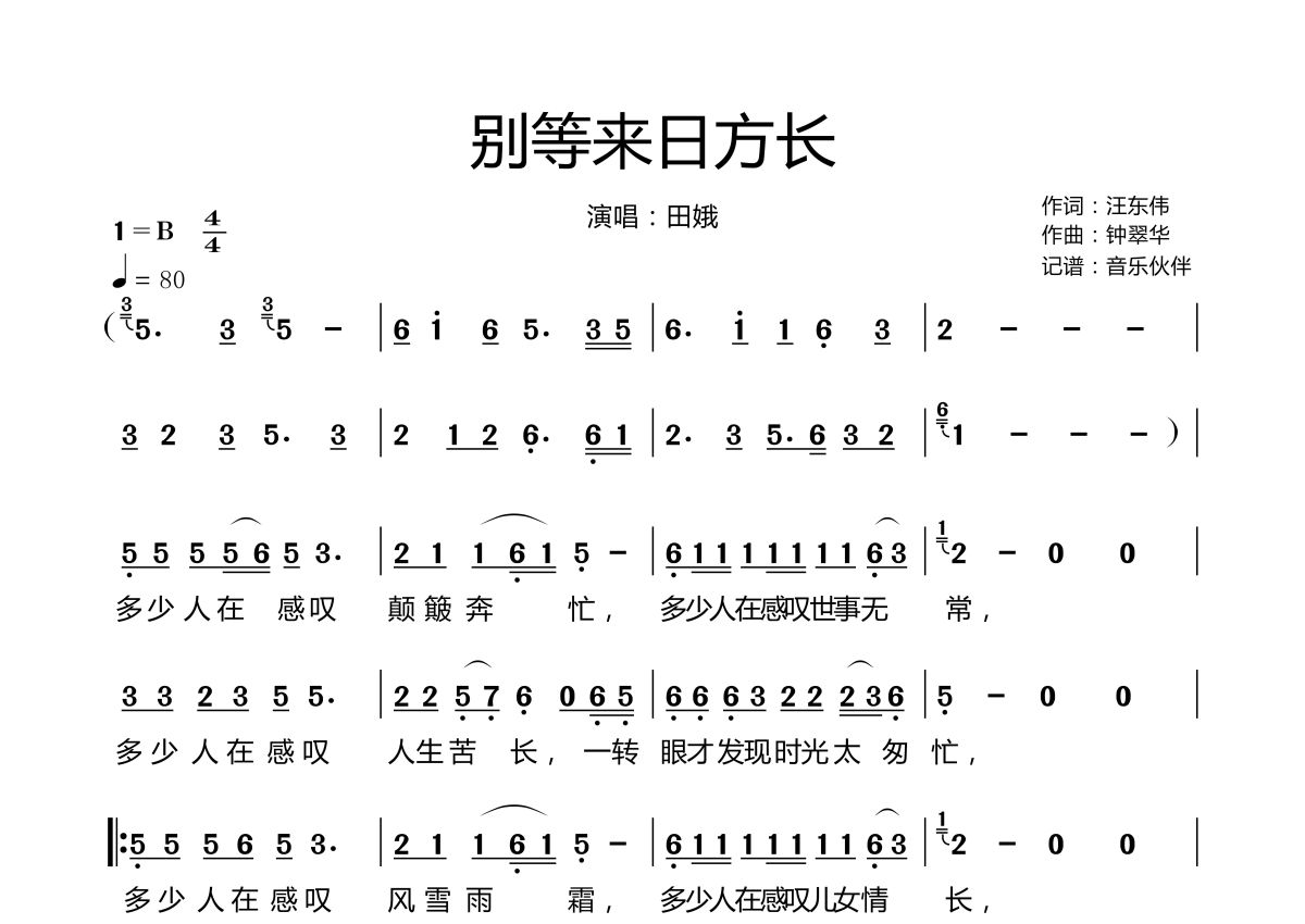 《别等来日方长》是田娥演唱的一首歌曲,拍号为4/4拍,歌曲速度为每分钟80拍,这份简谱共有两张高清图谱,图谱由 @音乐伙伴 编配上传。