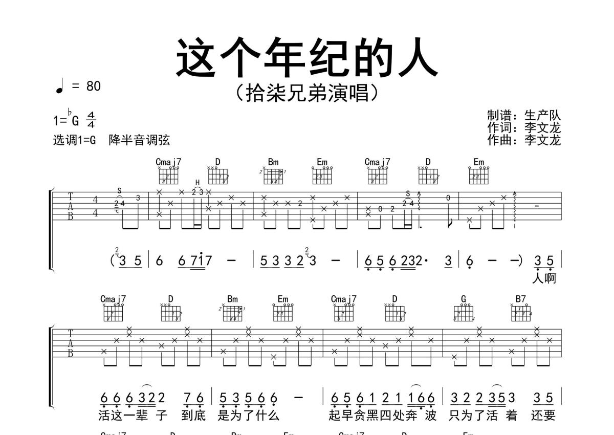 《这个年纪的人》是拾柒兄弟演唱的一首歌曲,精编完美版,拍号为4/4拍,歌曲速度为每分钟80拍,歌曲原调为Gb调,但由于原调指法比较难,为了方便弹奏,本吉他谱采用的是G调指法编配,降半音调弦弹奏即为原调,当然也可以根据自己的音域决定是否调弦,这份吉他谱共有两张高清图谱,图谱由 @生产队 编配上传,图谱使用六线谱编配,包含吉他和弦指法、简谱以及歌词部分,使用这份这个年纪的人吉他谱,可以让你更加方便地掌握这首歌曲的弹唱技巧,快来尝试吧。拾柒兄弟演唱的民谣歌曲《这个年纪的人》原版吉他谱,完整的前奏、间奏、尾奏solo编配,值得推荐的一首民谣歌曲。